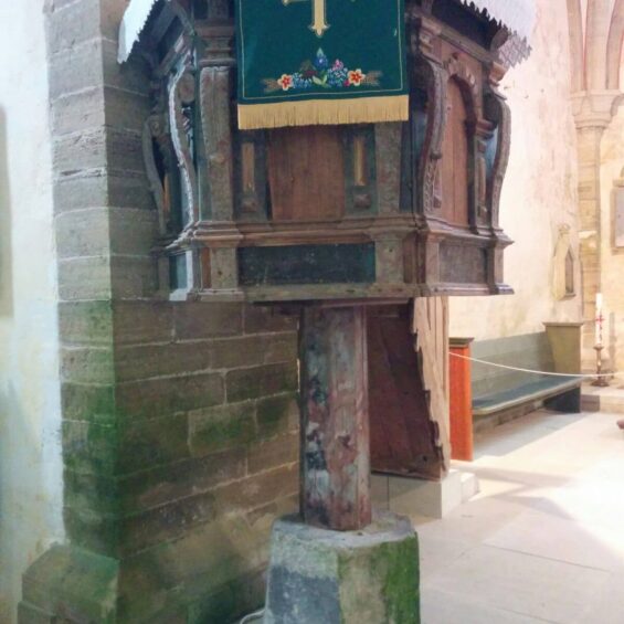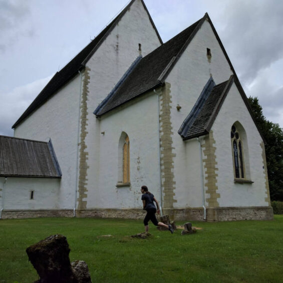 Während der folgenden 20km-Fahrt über die Insel Muhu besuchen wir in Liiva die St. Katharinen Kirche – man beachte die Statik der uralten Kanzel. Kurz vor dem Hafen geraten wir in einen Regenguss. Wir strampeln durch, und unsere Kleider trocknen auf der halbstündigen Fährüberfahrt wieder.