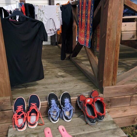 Naja, eine zweite Schnur hätten wir schon noch gehabt, auch ein weiteres Balkongeländer dazu, aber mit der Motivation zum Waschen wäre es schwierig gewesen, wenn alle ausgelaugt und schlechte Laune gehabt hätten 😉