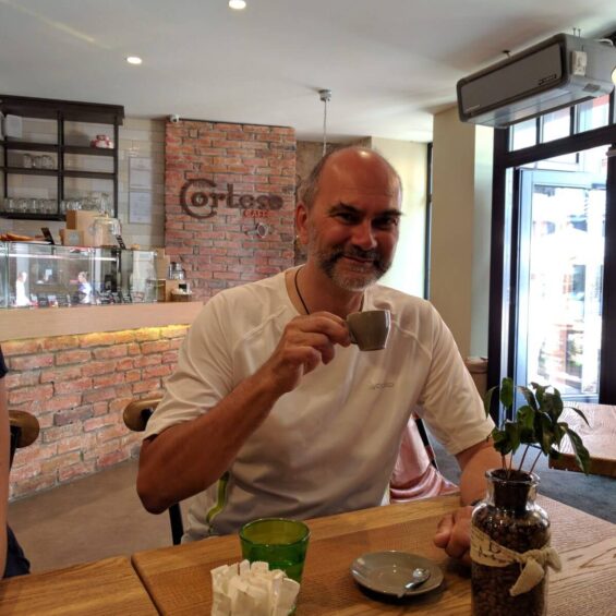 Gleich neben unserem Hotel liegt ein tolles Café mit kleinen, süssen Kunstwerken. Marco entdeckt darin eine echte, italienische Kolben-Espressomaschine, die es ihm wert scheint, einen Versuch zu wagen. Und tatsächlich, nach 2 nahezu entkoffeinisierten Wochen strahlt er ganz glücklich!
