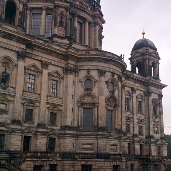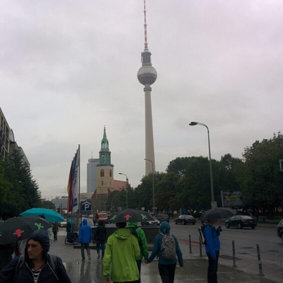 Vom Alexanderplatz spazieren wir in strömendem Regen zum DDR-Museum. Leider waren wir nicht die einzigen mit dieser Idee, die lange Schlange vor dem Eingang lässt uns gleich umdrehen. Stattdessen besuchen wir den Dom gleich gegenüber, und just, als wir auf die Kuppel gekraxelt sind, lichtet sich der Himmel ein wenig, sodass wir eine wunderbare Aussicht geniessen können.