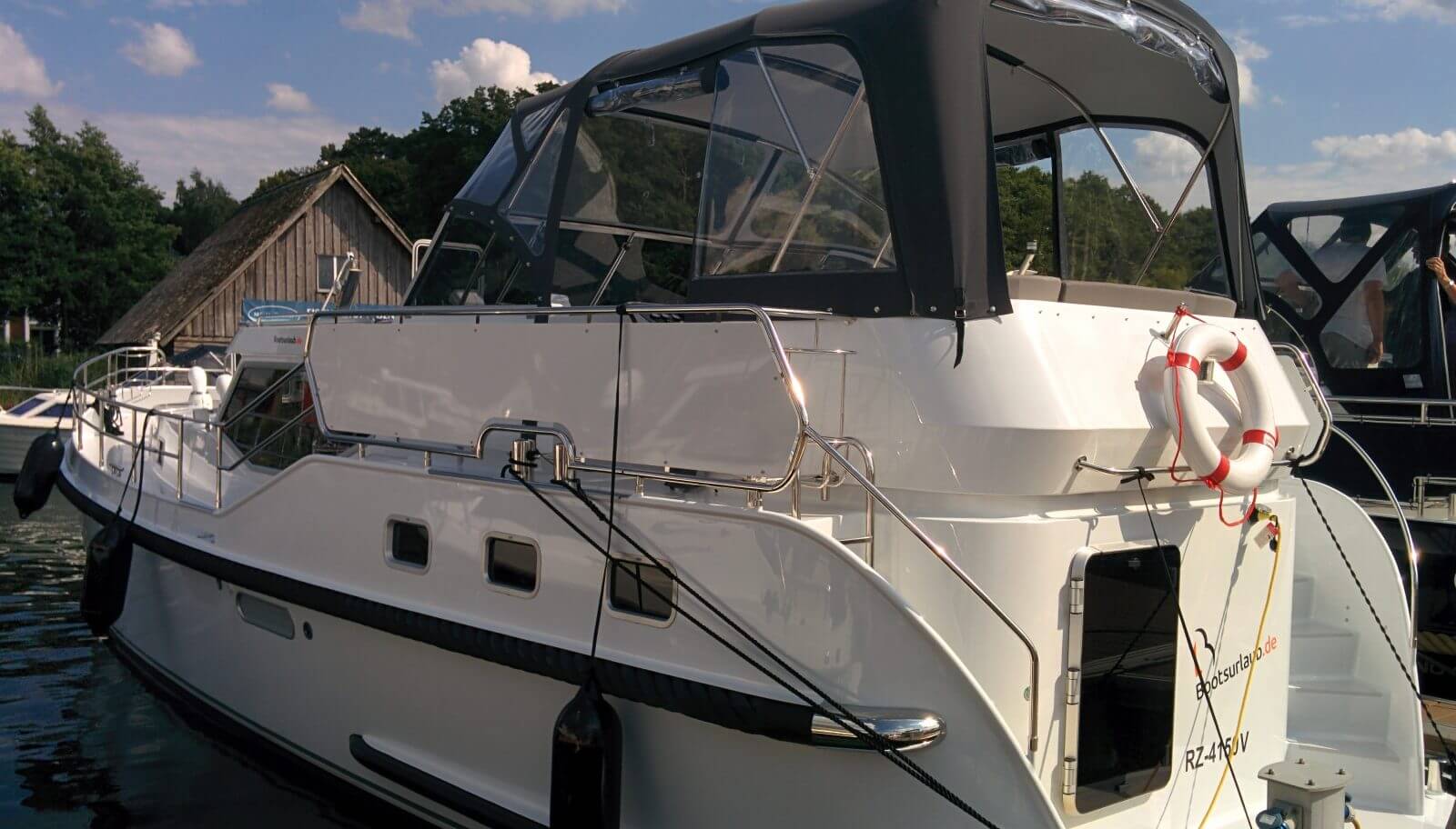 Hoppla – das Teil ist ja länger als mein Häuschen! Sieht voll nach Côte d’Azur aus. Natürlich drücke ich Julia und Marco die Damen für den Schein. Dürft Ihr nur damit losfahren auf den See raus zu den ergiebugen Fischgründen?