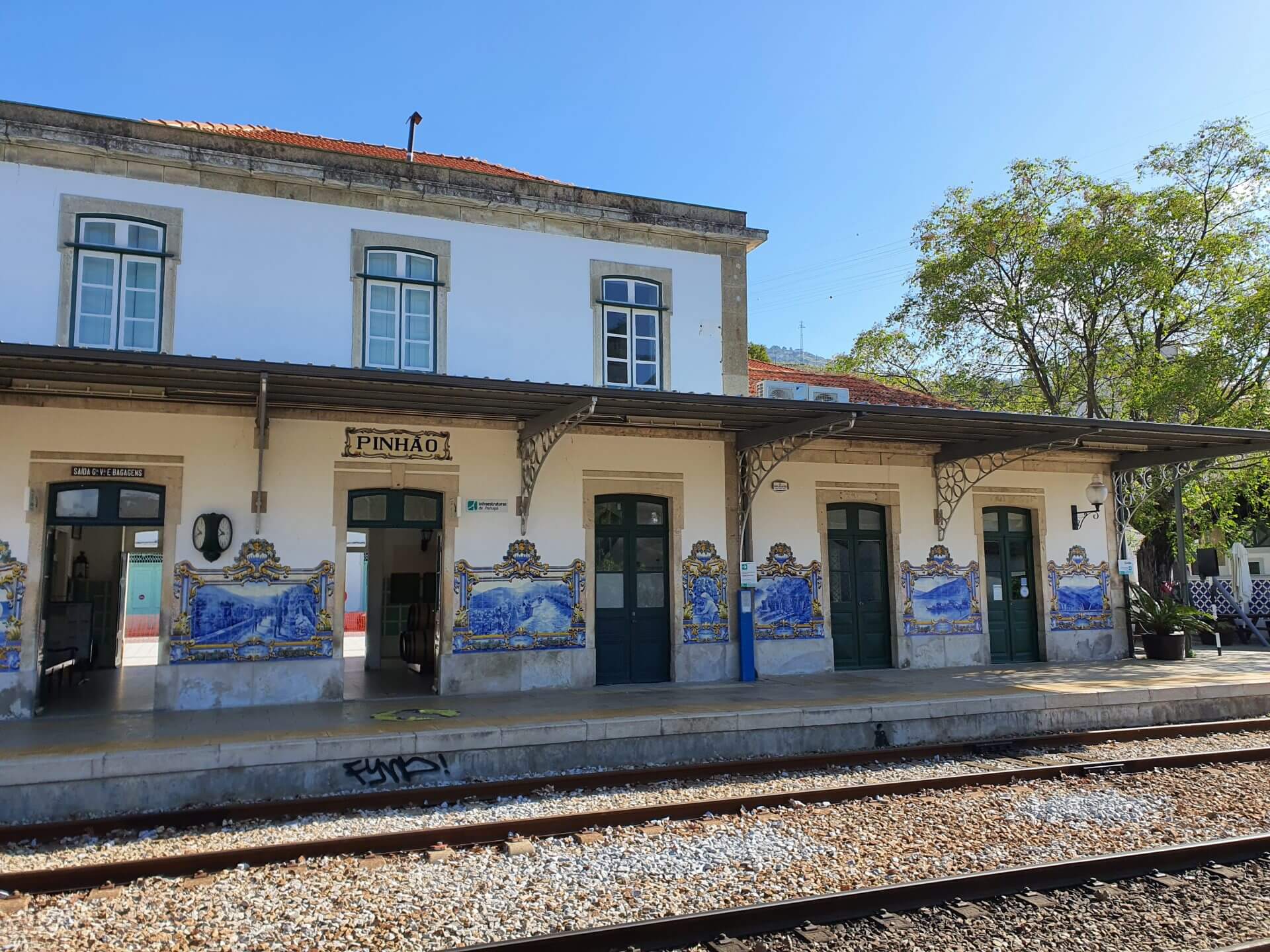 9.48 Uhr fährt der Zug von Pinhao nach Pocinho. Das Wetter könnte nicht besser sein, und der Zug ist kaum besetzt. Wir geniessen eine Stunde Fahrt und können uns kaum sattsehen. Was für ein Fluss! Zuerst zieht er sich breit und ruhig den Weinbergen entlang. Die Bahnlinie verläuft direkt am Ufer und oft gerade nur anderthalb Meter darüber. Es gibt keine Strasse, nur Rebenterrassen, Wasser und die Eisenbahnlinie.