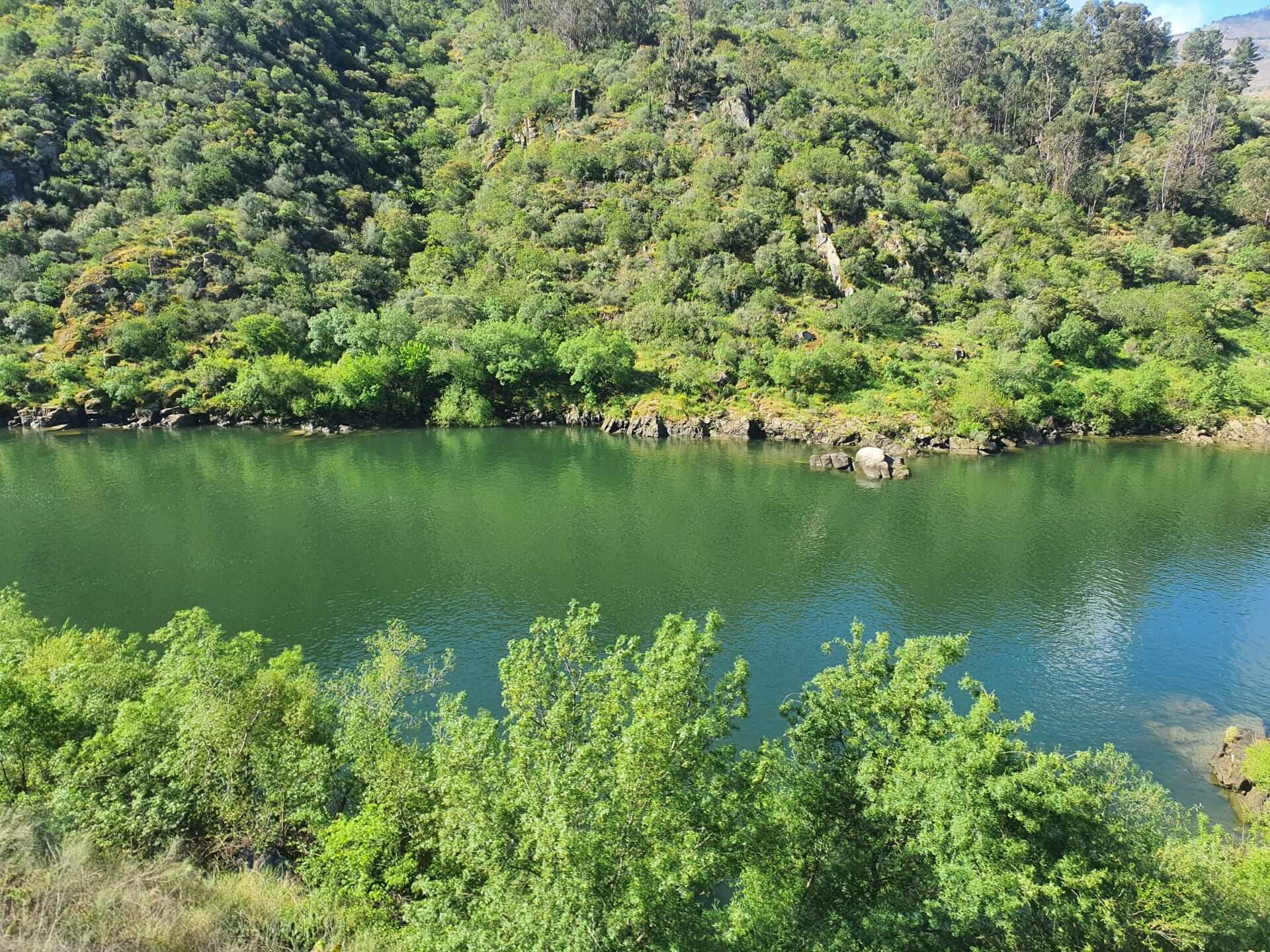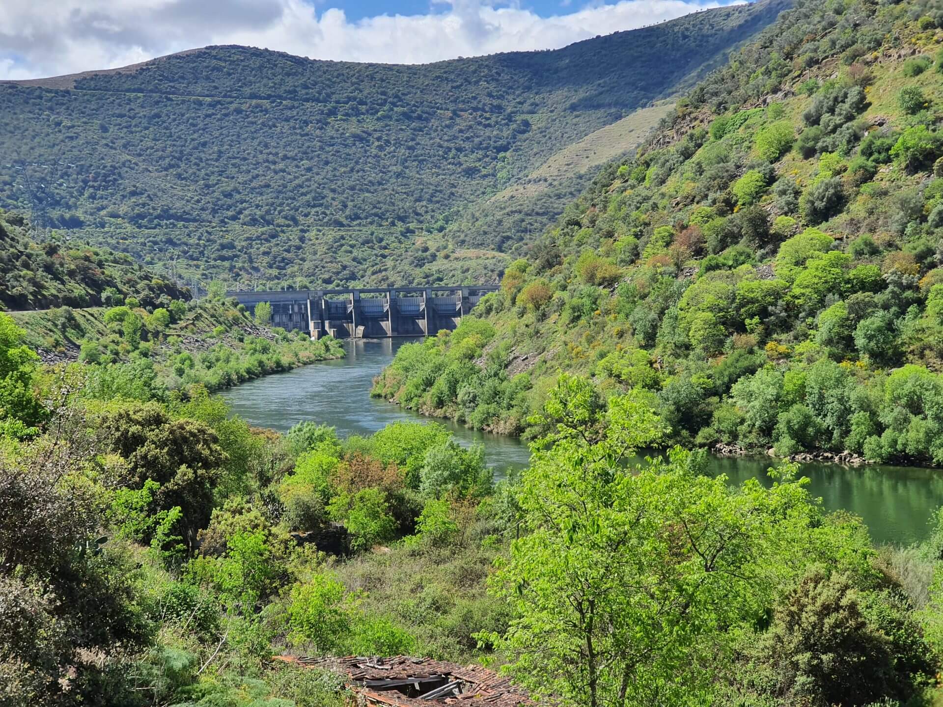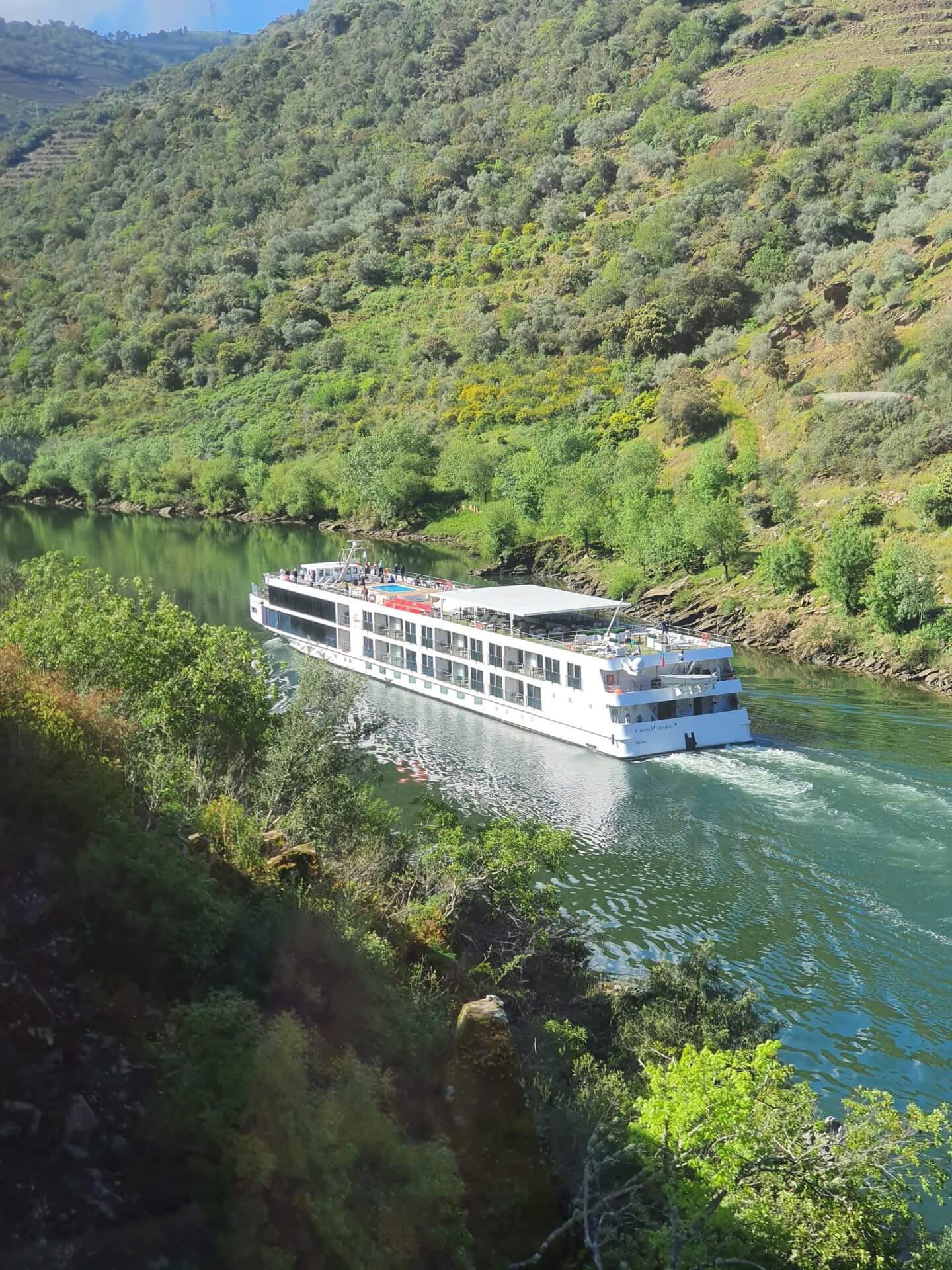 Allmählich wird der Douro nun immer schmaler, aber es verkehrt immer noch ein Kreuzfahrtsschiff, obwohl es fast an den Felswänden kratzt. Hier muss der Fluss wohl ziemlich tief sein, sodass die Schifffahrt trotzdem noch möglich ist. Etwas weiter oben dann der Staudamm inklusive Schleuse. In Portugal werden die meisten grösseren Flüsse mehrmals in ihrem Lauf gestaut und Elektrizität gewonnen.