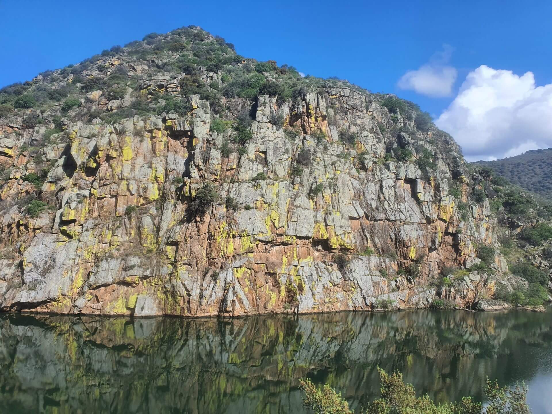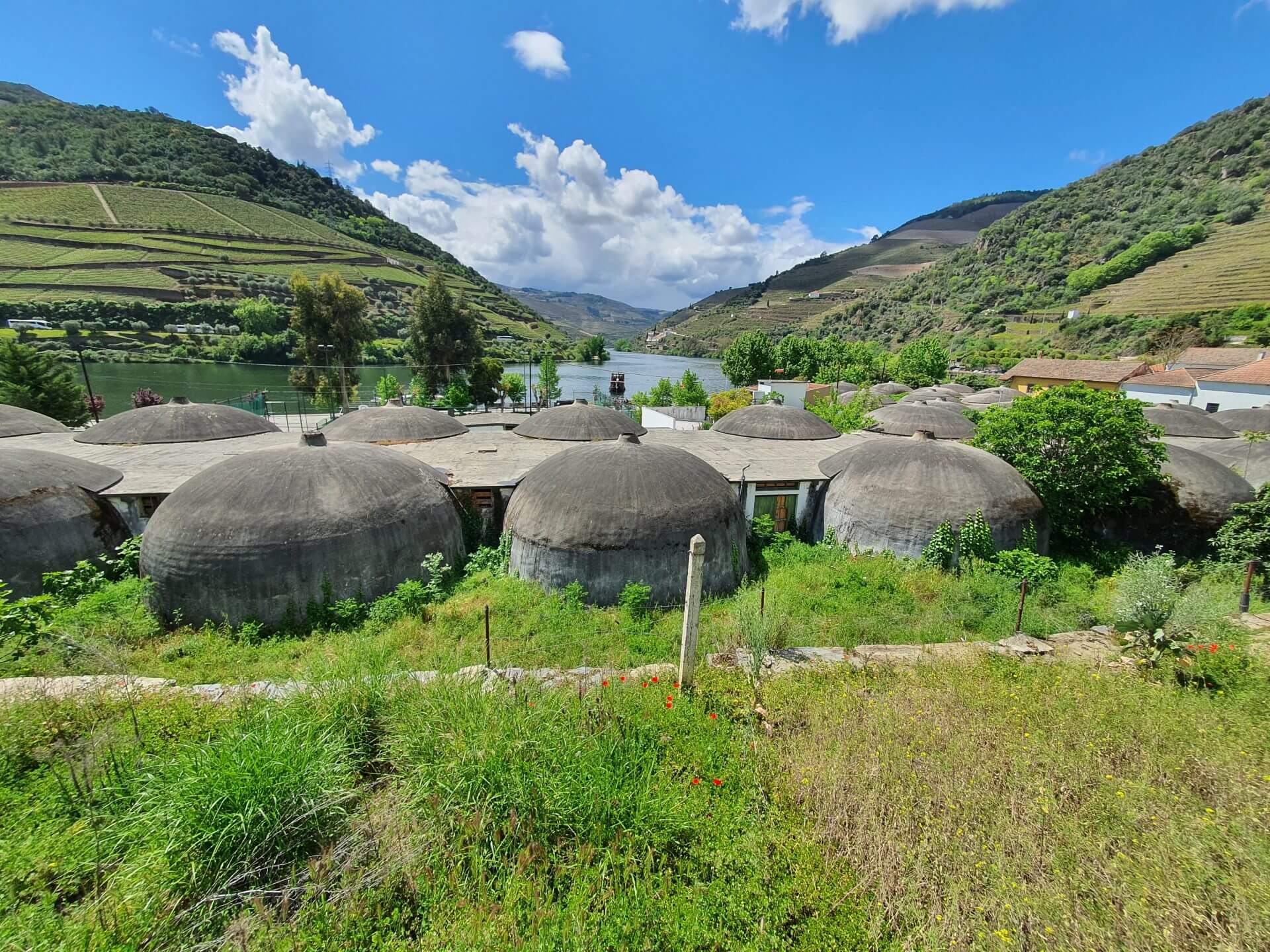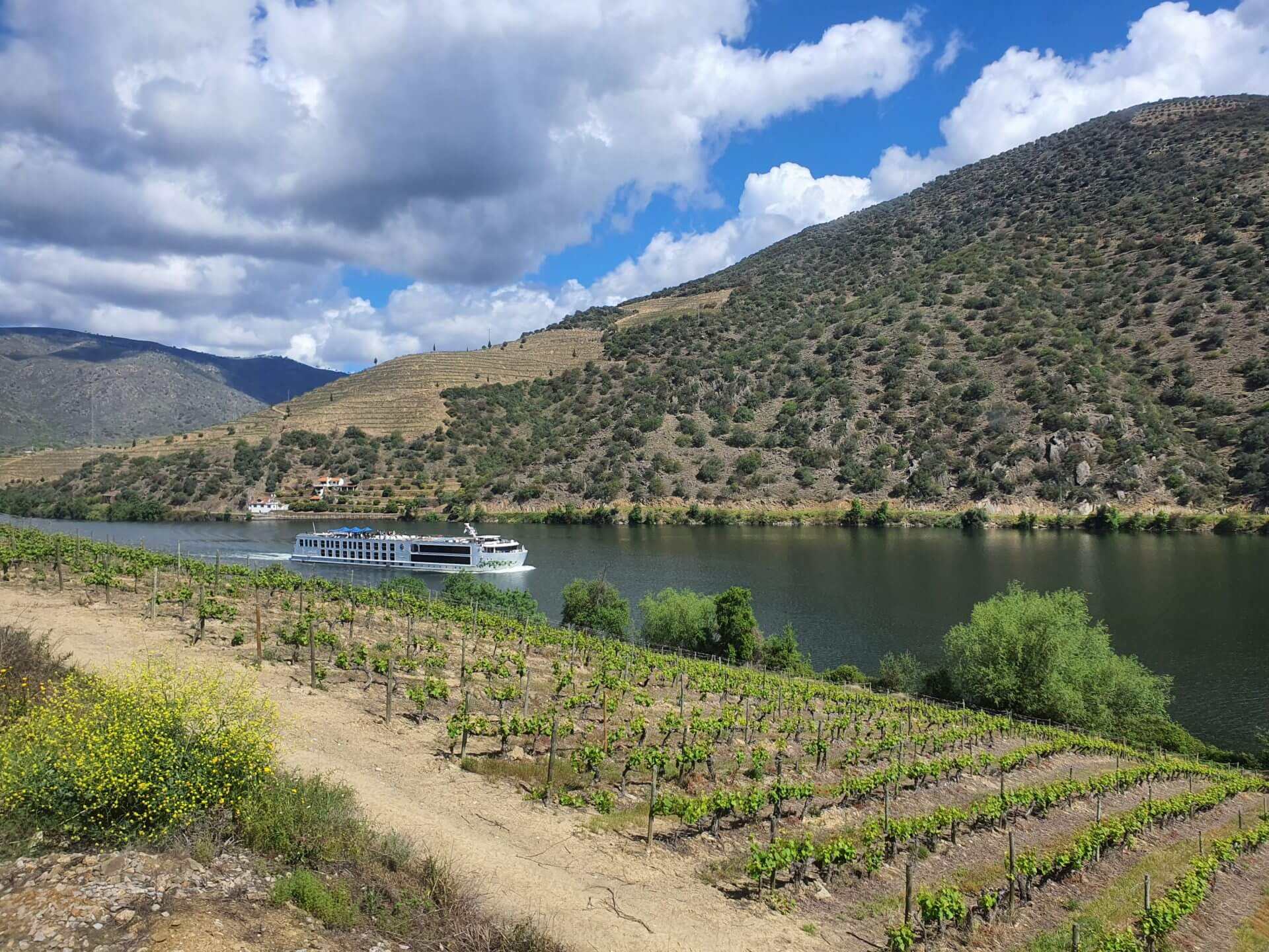 Allmählich wird der Douro nun immer schmaler, aber es verkehrt immer noch ein Kreuzfahrtsschiff, obwohl es fast an den Felswänden kratzt. Hier muss der Fluss wohl ziemlich tief sein, sodass die Schifffahrt trotzdem noch möglich ist. Etwas weiter oben dann der Staudamm inklusive Schleuse. In Portugal werden die meisten grösseren Flüsse mehrmals in ihrem Lauf gestaut und Elektrizität gewonnen.