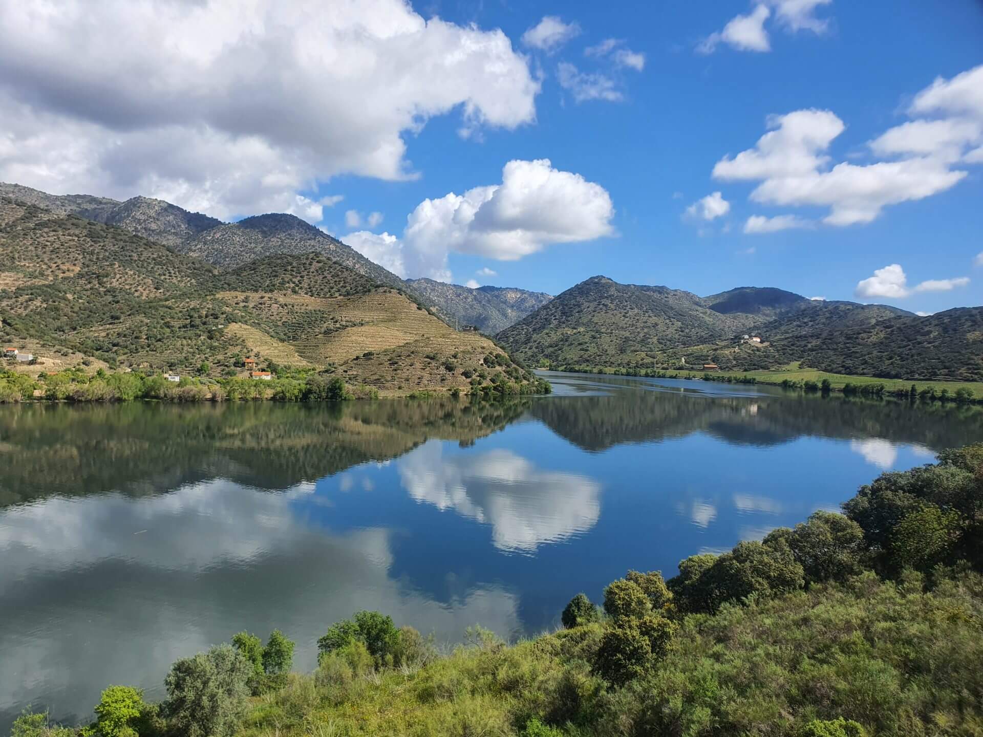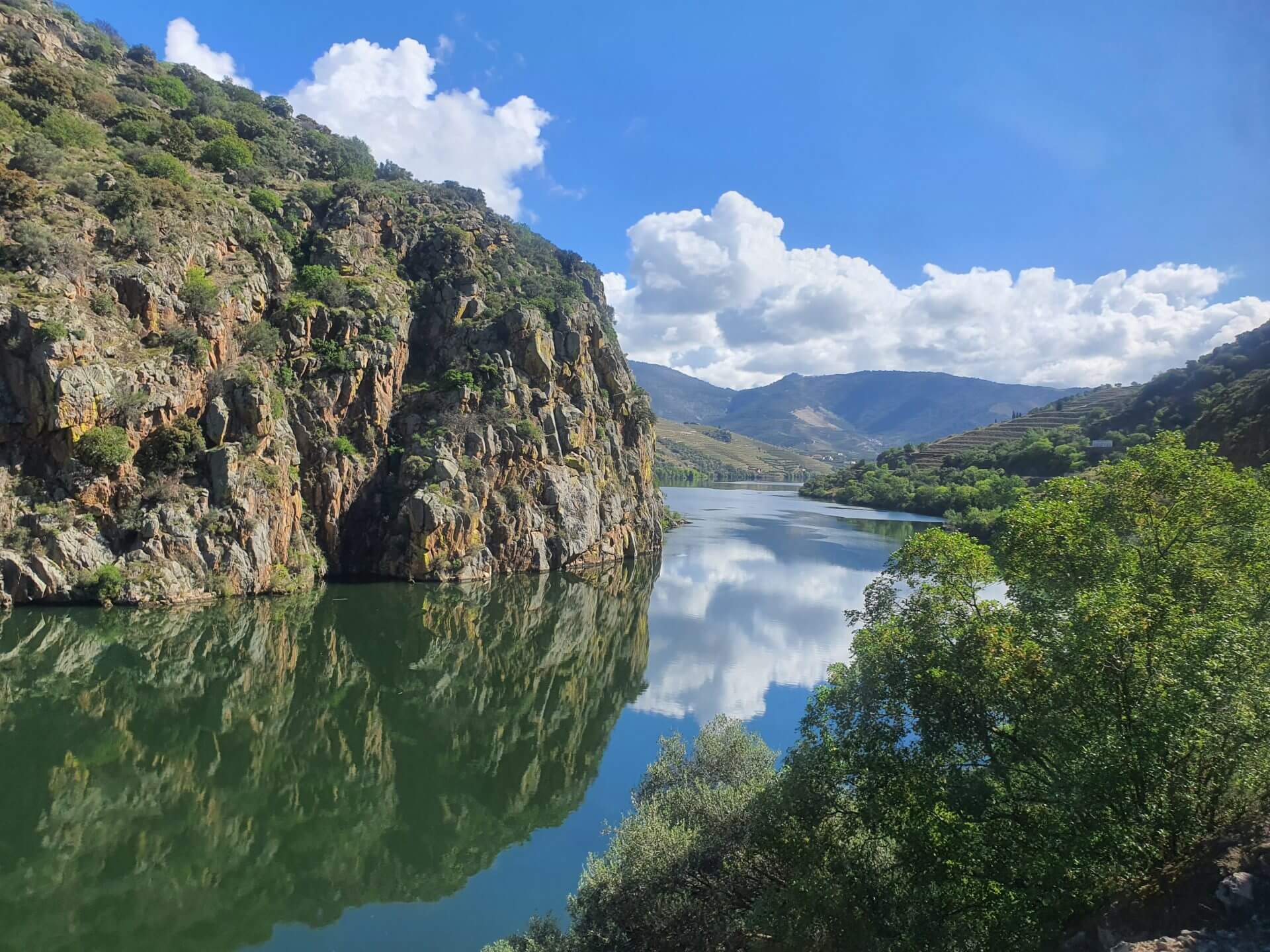 Wie sich die Wolken spiegeln im Wasser, wunderschön. Man könnte meinen, es sei ein langgezogener See und nicht ein Fluss. Die Weinberge sind beeindruckend. Auf dem Bahnhof von Pinhão würde ich auch gerne auf einen Zug warten und die Bilder bestaunen. Kein Vergleich mit unserem hektischen Pendeln. Glücklicherweise gibt es ja diese Erholungsgebiete und Ihr macht das richtig!