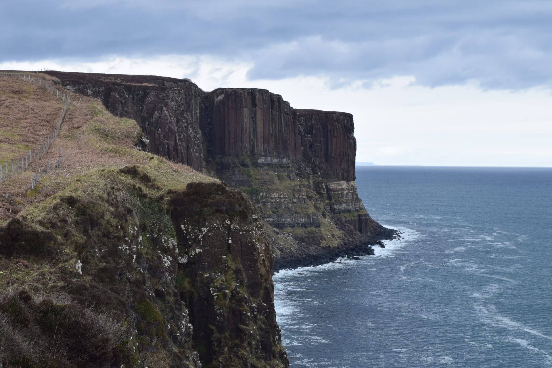 Dann ging die Reise auch schon weiter durch die Trotternish Peninsula. Dort sahen wir die berühmte Steinformation Old Man of Storr. Weiter ging es dann zum Kilt Rock. Dieser hat seinen Namen erhalten, da Queen Victoria zu Besuch kam. Der Stein mit den vertikalen und horizontalen Streifen erinnerte sie an das Tartan Muster, das traditionell für Kilts verwendet wird. Seither heisst diese Klippe Kilt Rock. An dieser Küste gibt es auch fossile Dinosaurier Fussspuren. Die habe ich aber leider nicht gesehen.